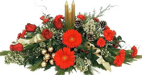 Wish someone a merry Christmas with a centerpiece of roses, gerberas and mixed seasonal flowers in warm colors, decorative greenery and candles. Suitable for Christmas festivities.