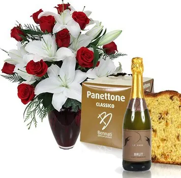 Wish someone a merry Christmas with a bouquet of 12 red roses and light-colored lilies decorated with seasonal greenery, paired with a panettone and a sparkling wine bottle. Suitable for Christmas festivities.