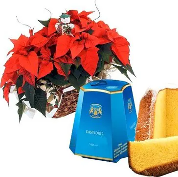 Wish someone a merry Christmas with an arrangement of first-class red poinsettia plants in a basket decorated with seasonal greenery, paired with a pandoro. Suitable for Christmas festivities.