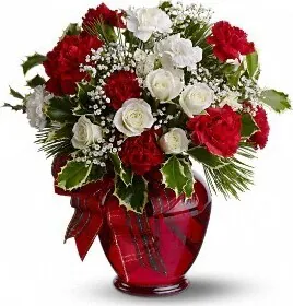 Wish someone a merry Christmas with a bunch of white and red roses and mixed seasonal flowers, decorated with greenery. Suitable for Christmas festivities.