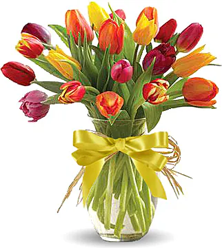 Multicolor Tulips arrangement decorated with seasonal greenery. Suitable for love, congratulations, birthdays, weddings, anniversaries and inaugurations.