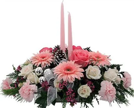 Wish a merry Christmas with a centerpiece with mixed seasonal Flowers, Christmas greenery and candles. Suitable for Christmas festivities.