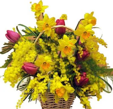 Elegant arrangement of tulips in warm colors and mimosas, suitable for Women's Day.